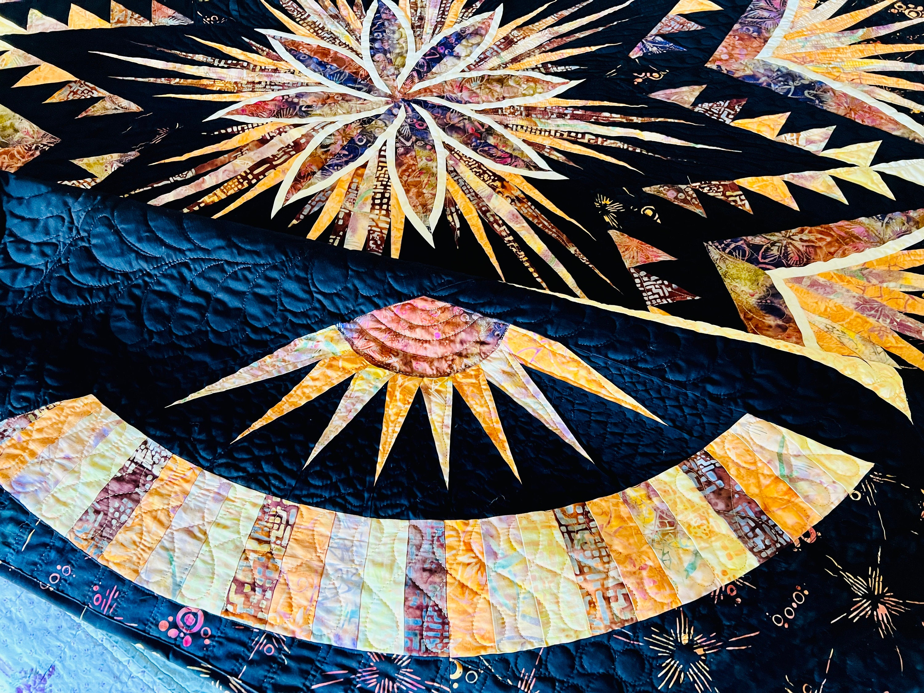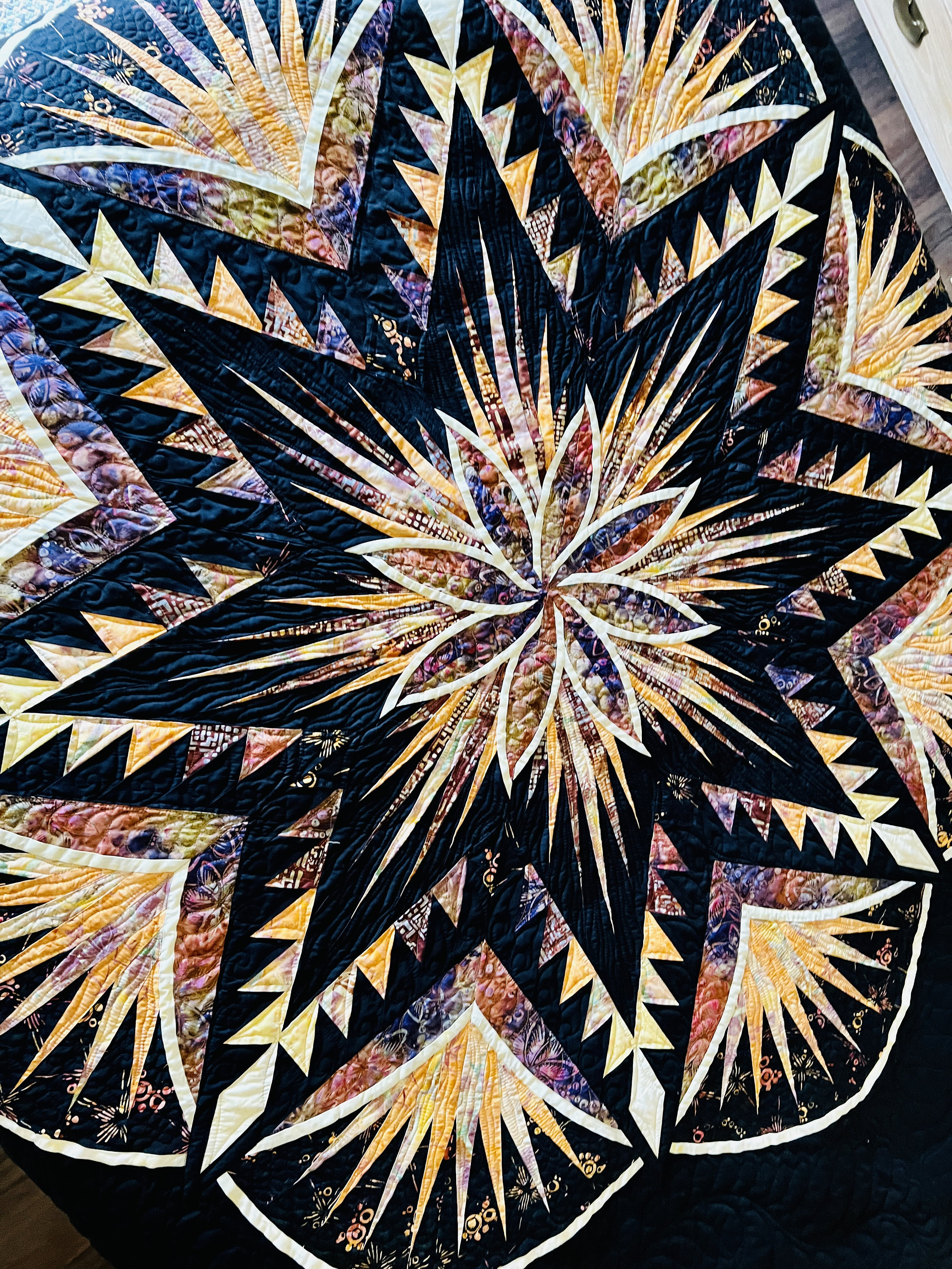 Craftsmanship: Foundation paper pieced for precise points; custom quilted for unique artistic appeal.