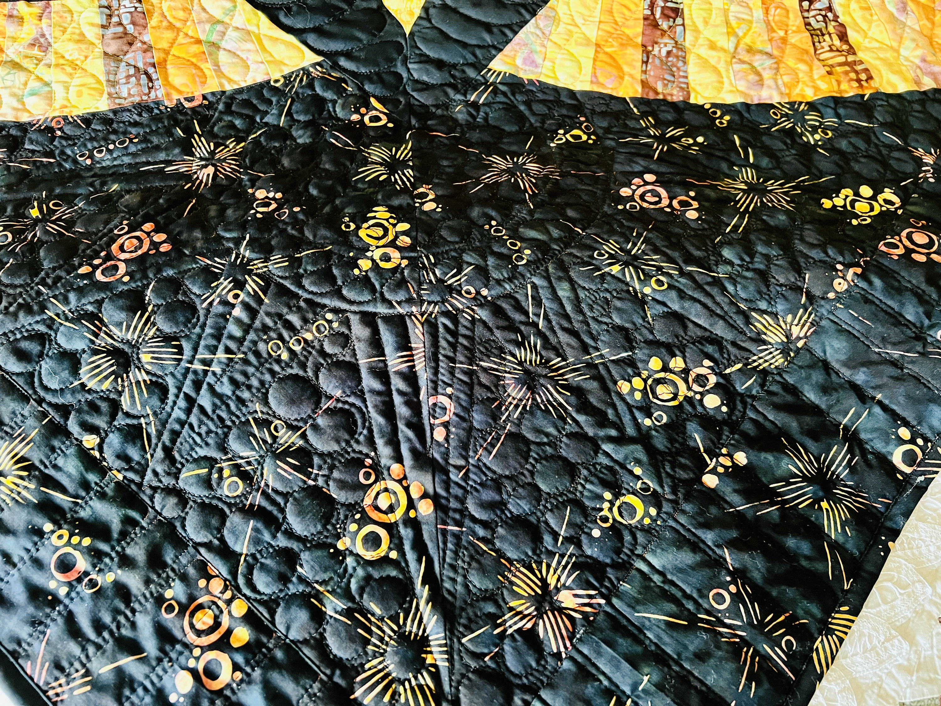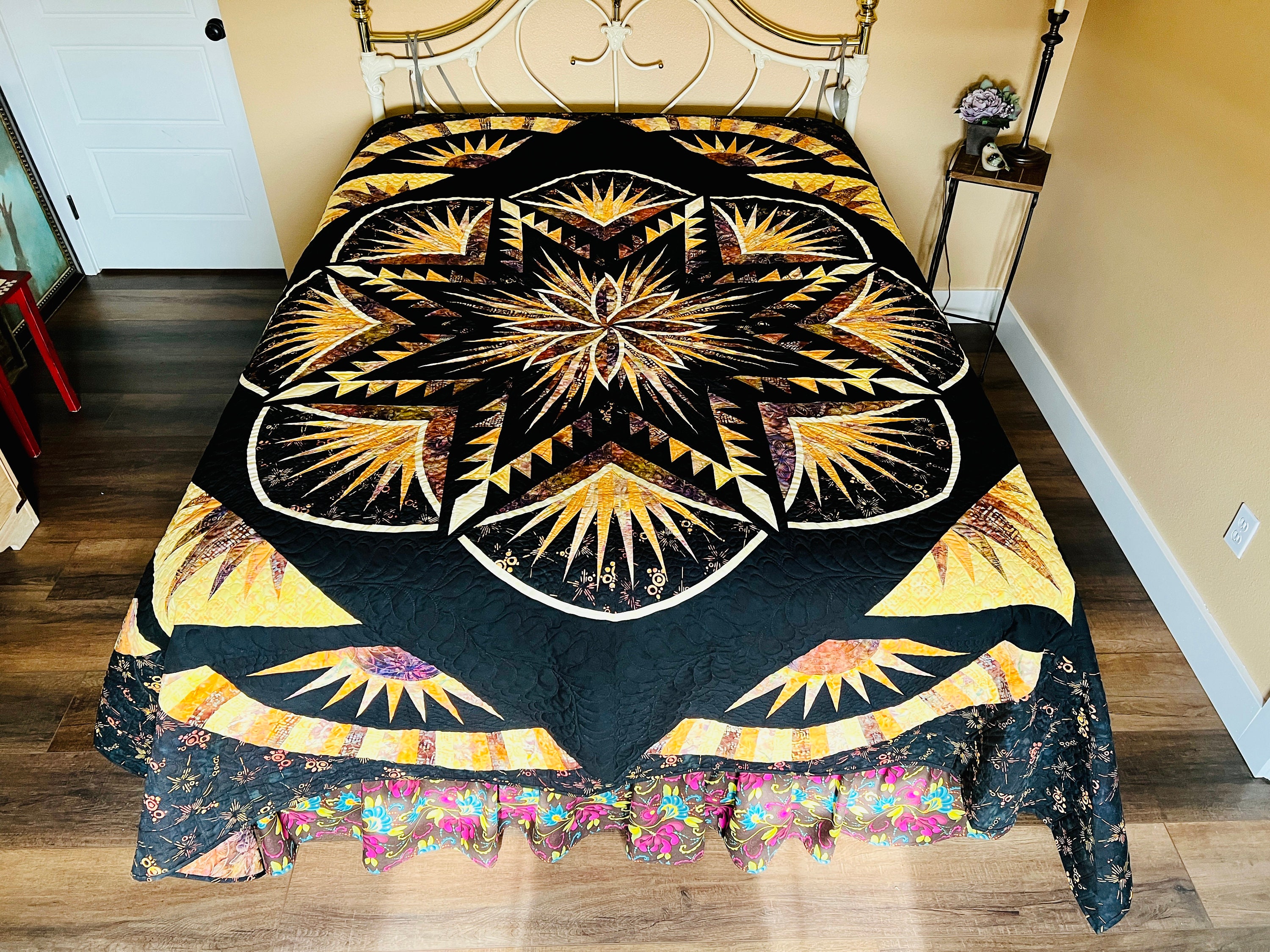 This beautiful queen-sized quilt exudes bold drama. Crafted using exquisite hues of gold and striking black batiks, the design was meticulously foundation paper pieced to ensure precise points and maximum visual impact—a signature of acclaimed designer Judy Niemeyer.
