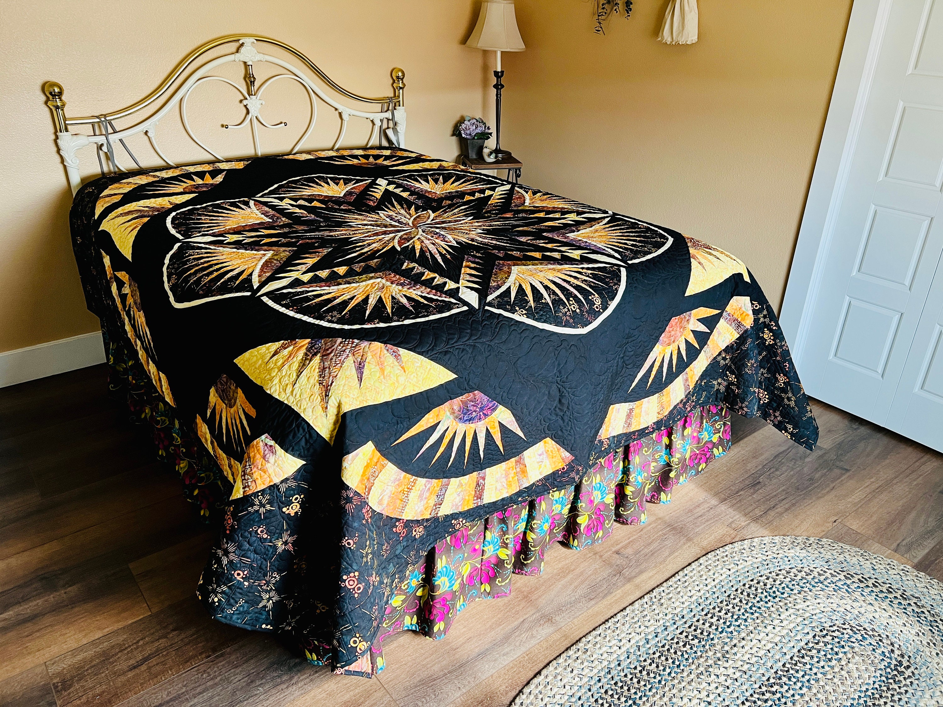 This unique quilt features custom quilting that enhances its artistic appeal, making it a one-of-a-kind masterpiece. It’s perfect for adding drama to your master bedroom decor or impressing your guests when displayed on a guest room bed!