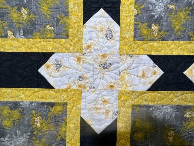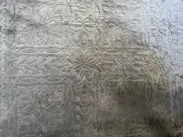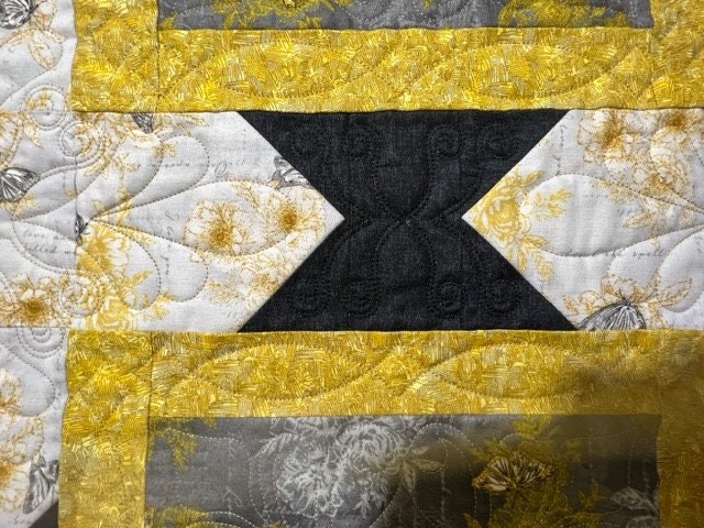 This striking quilt features a modern palette of bright golds, elegant greys, and deep charcoal greys. What truly sets "Ponder" apart is the luxurious minky backing, which is soft to the touch and highlights the stunning custom quilting with incredible depth and texture in every block.