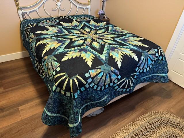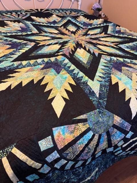 Prepare to be wowed! This gorgeous "Steampunk Fairytale Kaleidoscope" queen size quilt, designed by Judy Niemeyer with Quiltworx studios, makes a stunning addition to any home.