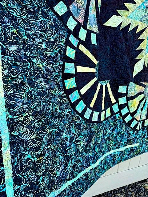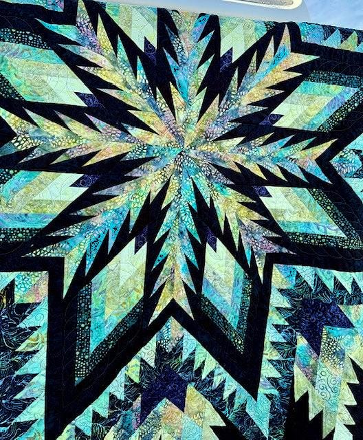 This art quilt is a true showstopper, featuring a high-contrast color palette of sophisticated navys and electric, stunning lime green batiks. The effect is breathtaking—it looks exactly like intricate stained glass!