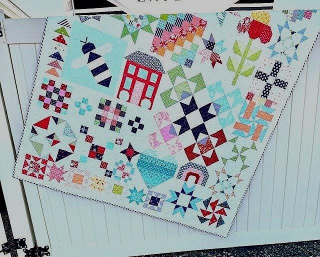 You won't want to miss out on the delightful mix of blocks, featuring adorable bees, whimsical flowers, a charming bee block, and a large coneflower block. The vibrant, scrappy fabric blocks make this quilt a perfect, happy addition to any home decor.