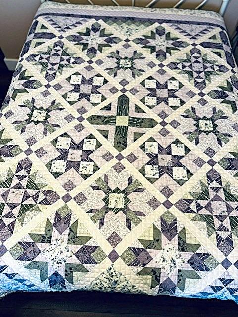 Crafted in soothing lavender and sage green fabrics, this quilt is the perfect addition to any garden-themed decor. The design features beautiful floral motifs and a delicate lattice pattern meticulously quilted into the fabric, adding an extra special sense of serenity and elegance.