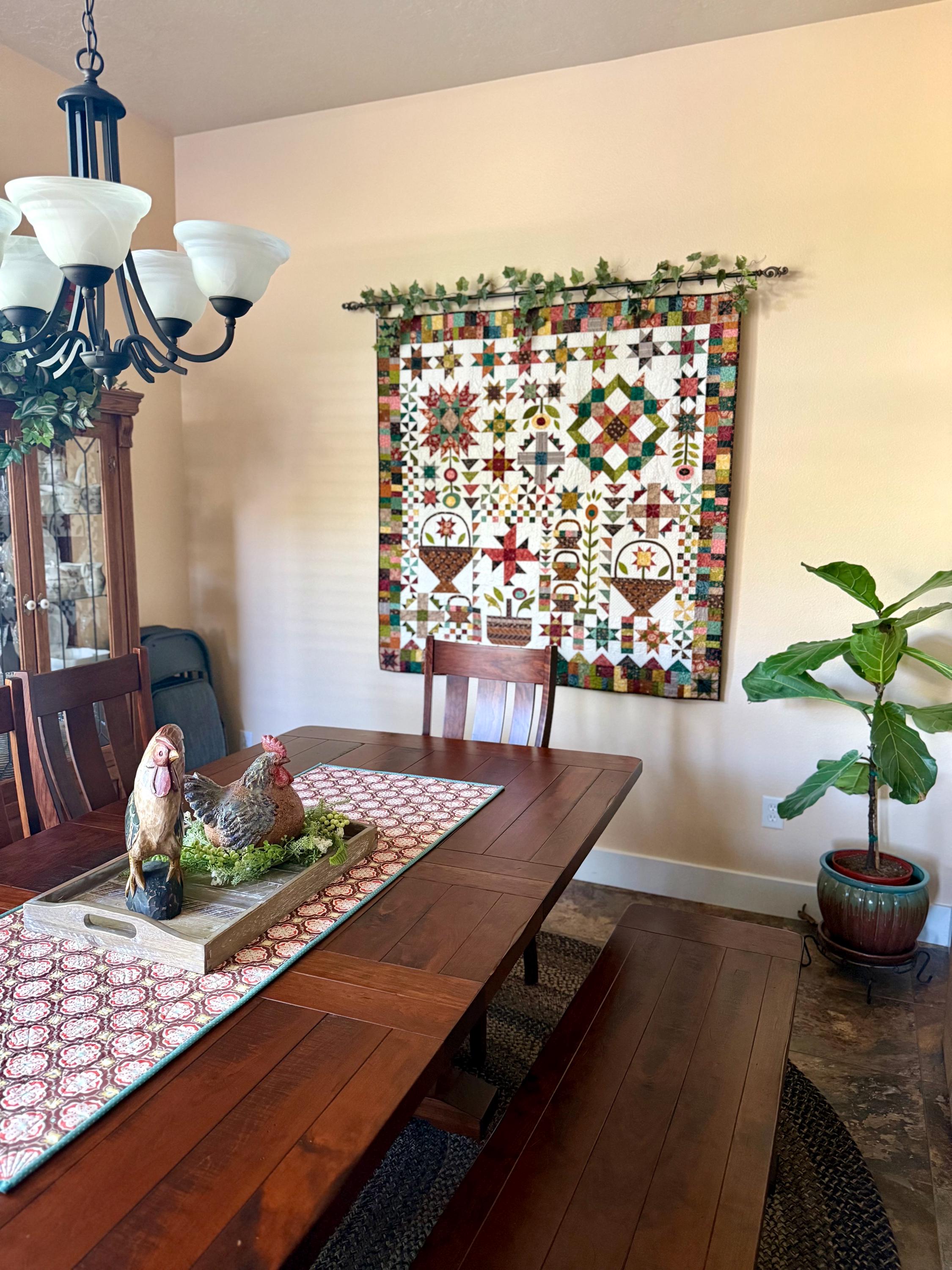 This versatile 58"x58" square quilt makes a spectacular statement piece. Use it as a striking wall hanging to add warmth to a room, or drape it over a sofa as a cozy, colorful throw. You can't go wrong with this intricately crafted piece that blends traditional piecing and appliqué techniques.