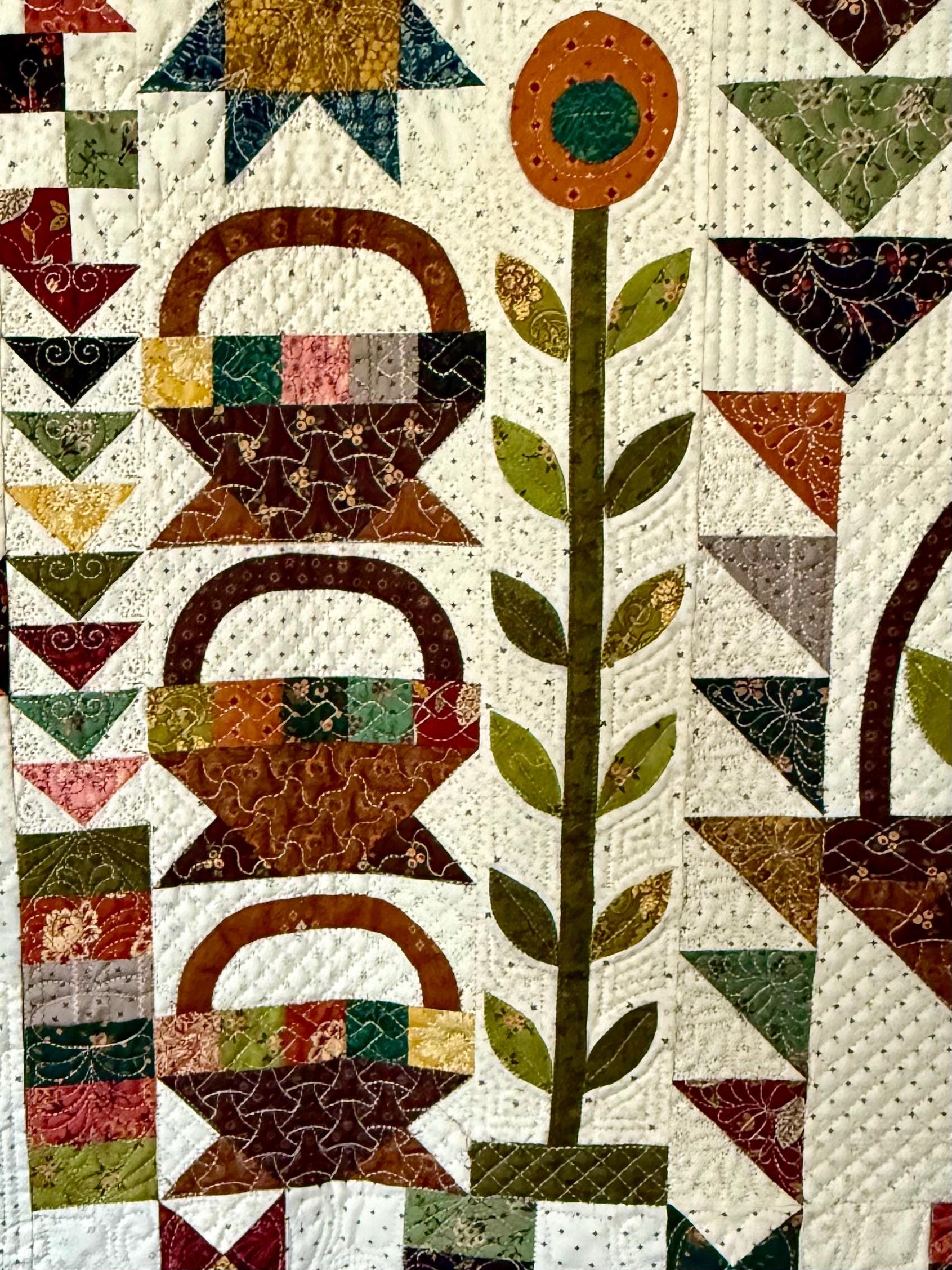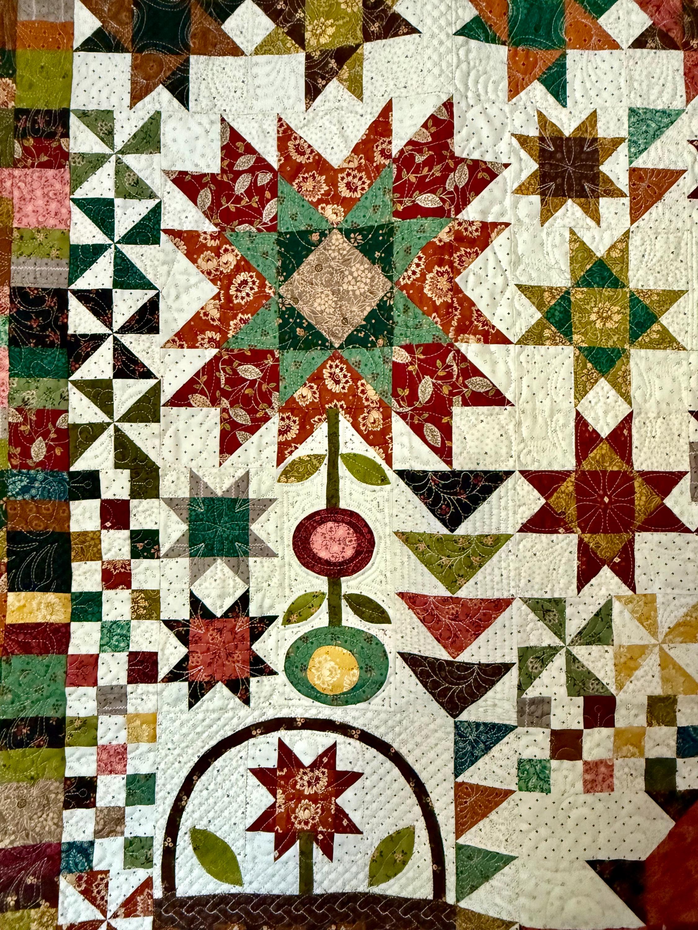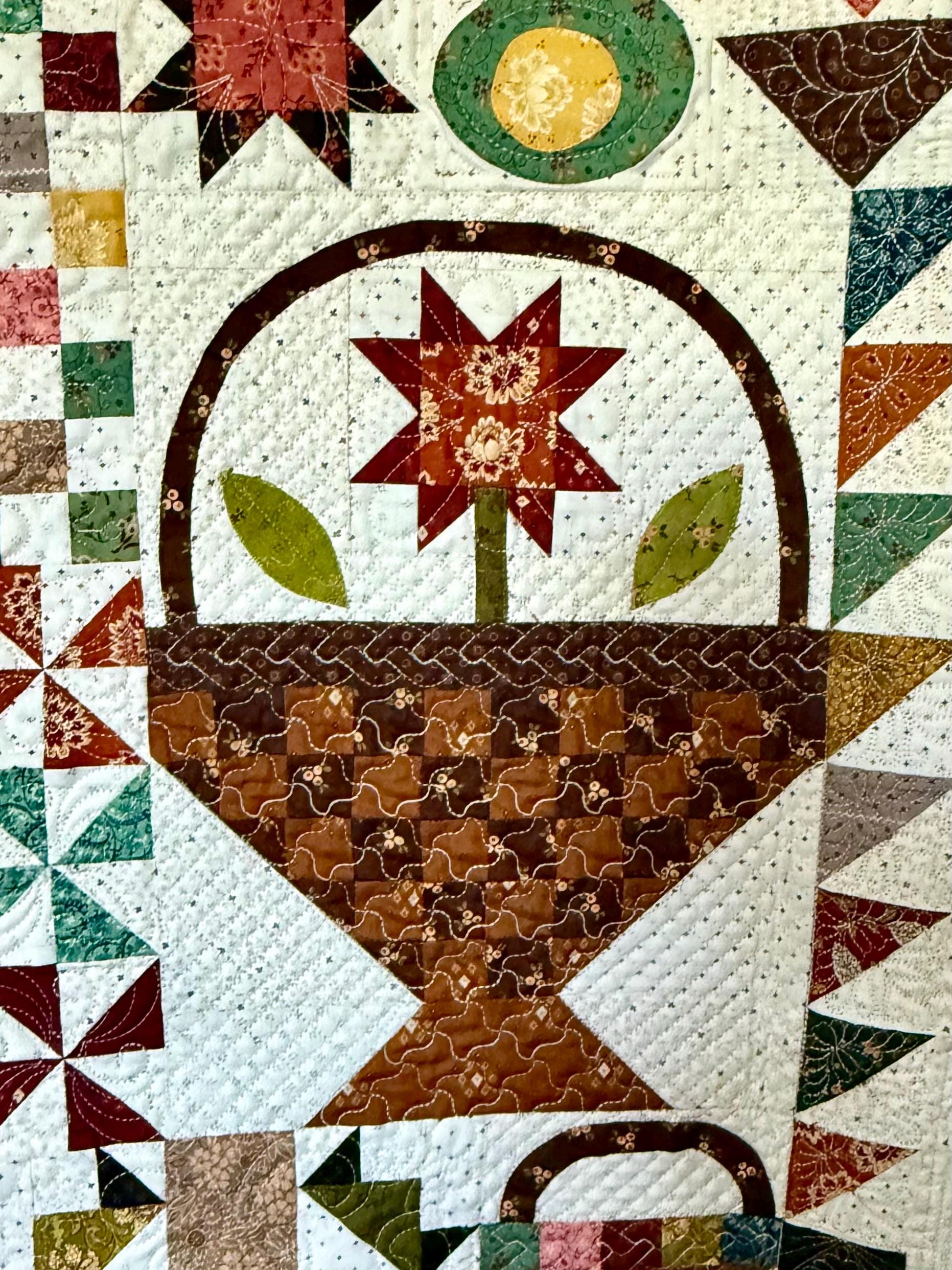 Motifs: Stars, baskets, pinwheels, checkerboard, and blooms.