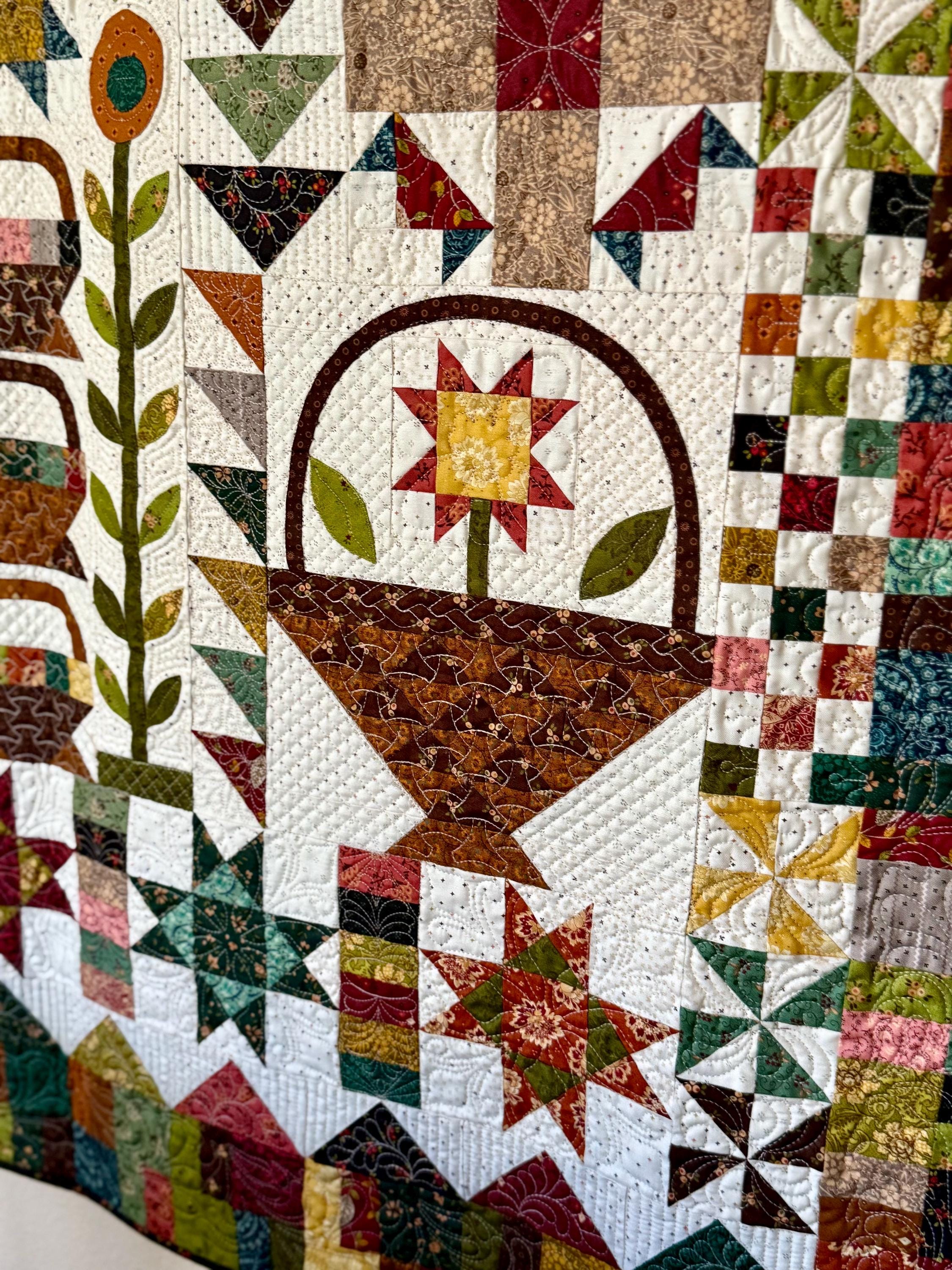 This heirloom-quality piece showcases the beautiful "Quiet Grace" collection by Kim Diehl for Henry Glass Fabrics. The design is a delightful array of classic motifs, including sparkling stars, charming baskets, colorful pinwheels, scrappy checkerboard squares, and a delicate sprinkling of appliquéd blooms.