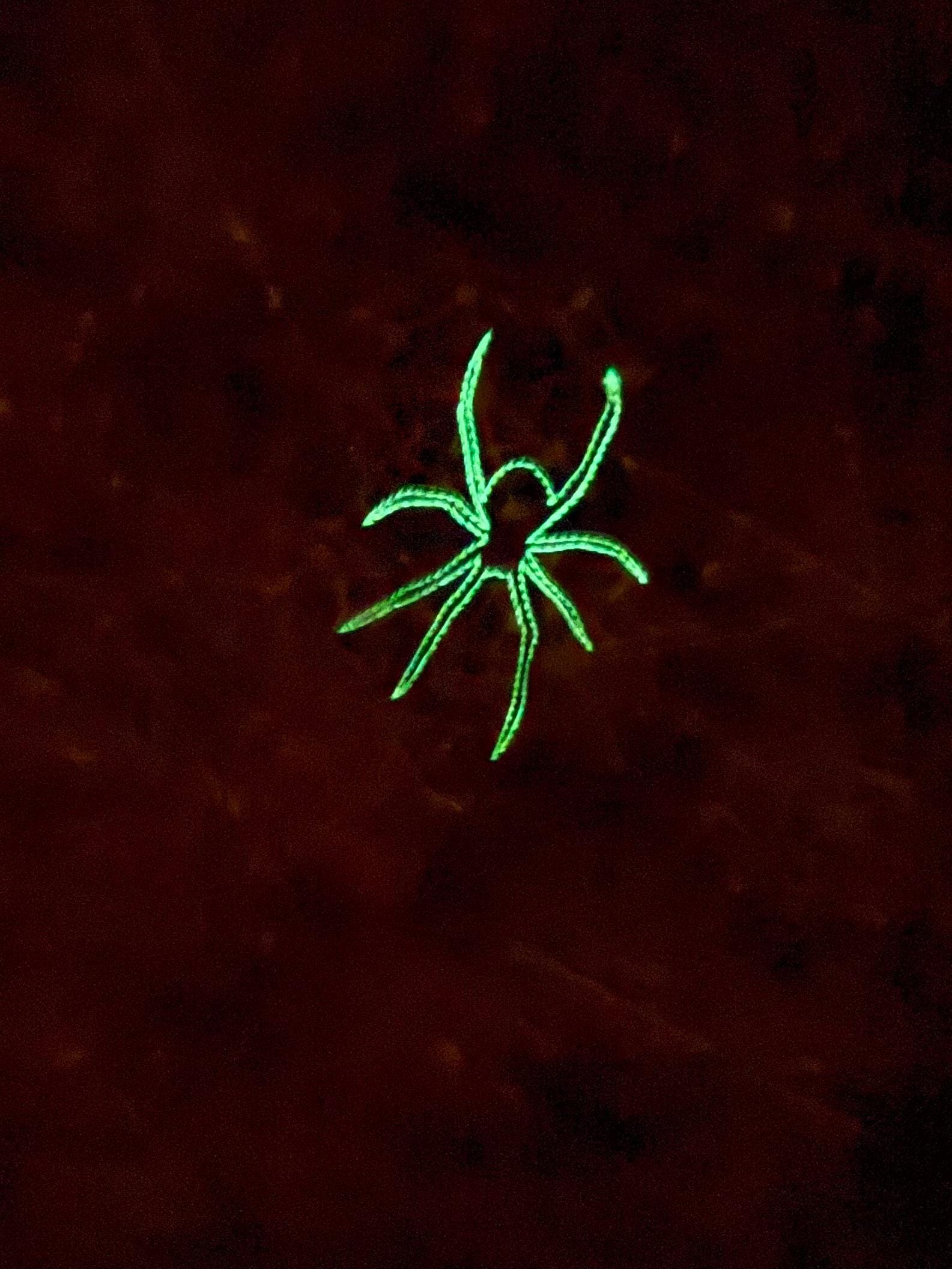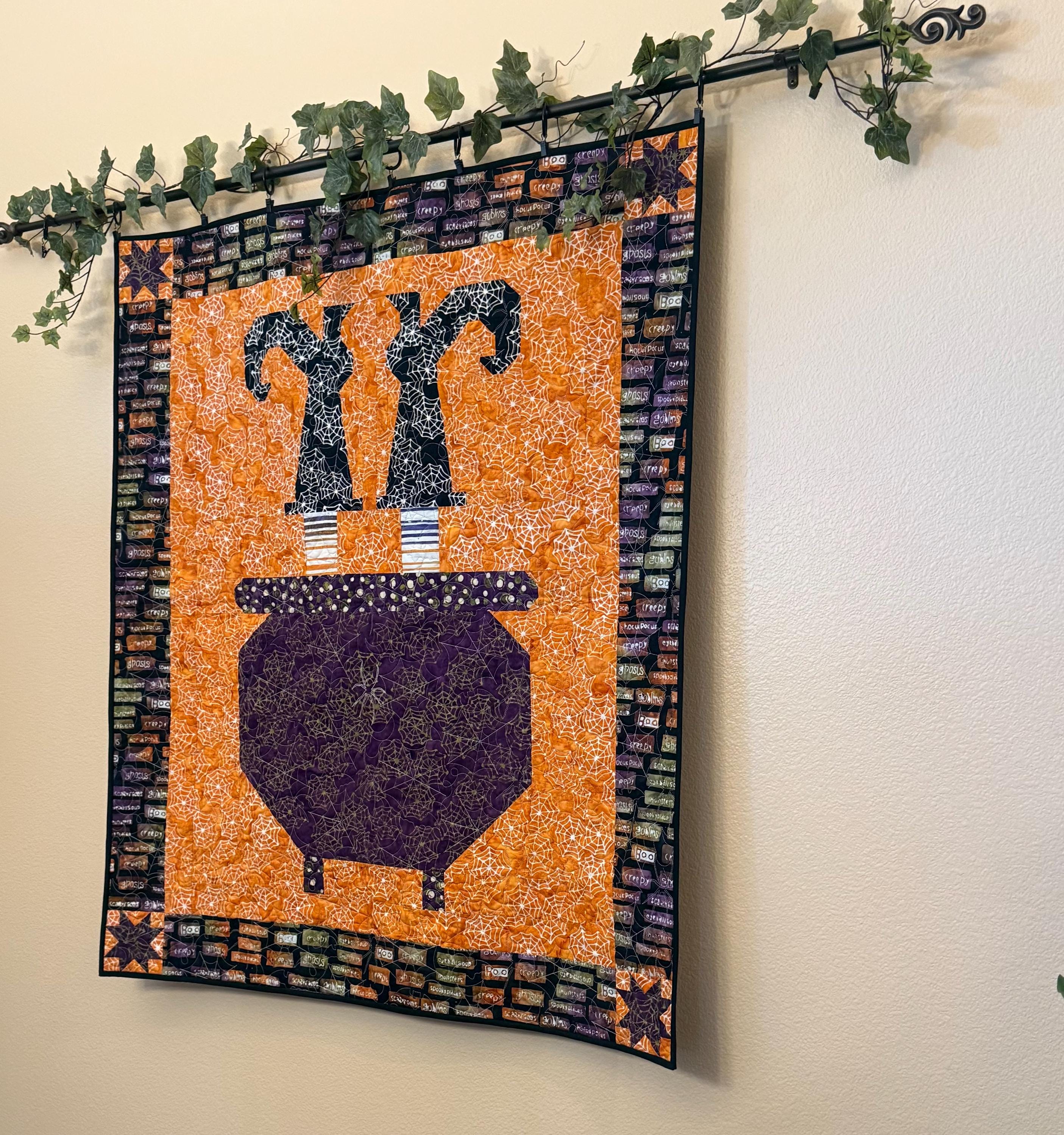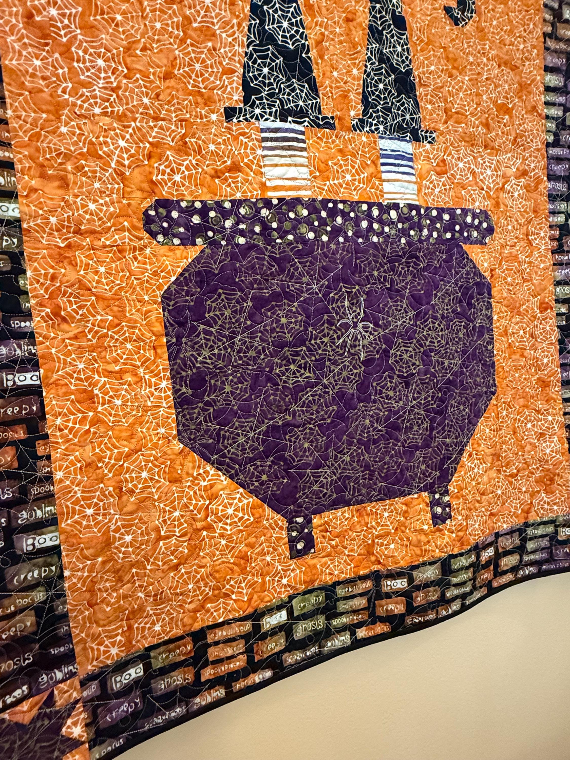 Designed by Riley Blake Designs, this charming piece is machine-quilted with delightful spiders and spooky spider webs throughout. The ultimate feature? A glow-in-the-dark spider right in the center of the witch's cauldron! 🕷️✨
